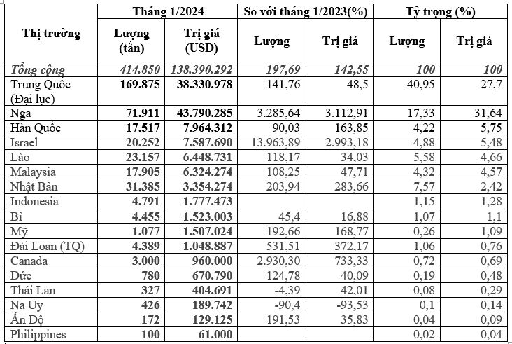 Tiếp sau đó là thị trường Nga chiếm trên 17,3% trong tổng lượng và chiếm 31,6% trong tổng kim ngạch phân bón nhập khẩu của cả nước, đạt 71.911 tấn, tương đương gần 43,79 triệu USD, giá trung bình 609 USD/tấn, tăng 27,3% về lượng, tăng 86,4% về kim ngạch và tăng 46,4% về giá so với tháng 12/2023; so với tháng 1/2023 tăng mạnh 3.286% về lượng, tăng 3.113% về kim ngạch nhưng giảm 5,1% về giá.
