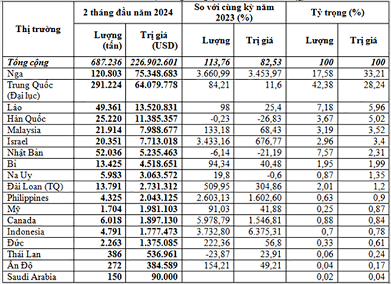 Tiếp sau đó là thị trường Trung Quốc chiếm 42,4% trong tổng lượng và chiếm 28,2% trong tổng kim ngạch, đạt 291.224 tấn, tương đương 64,08 triệu USD, giá trung bình 220 USD/tấn, tăng 84,2% về lượng, tăng 11,6% kim ngạch nhưng giảm 39,4% về giá so với 2 tháng đầu năm 2023.